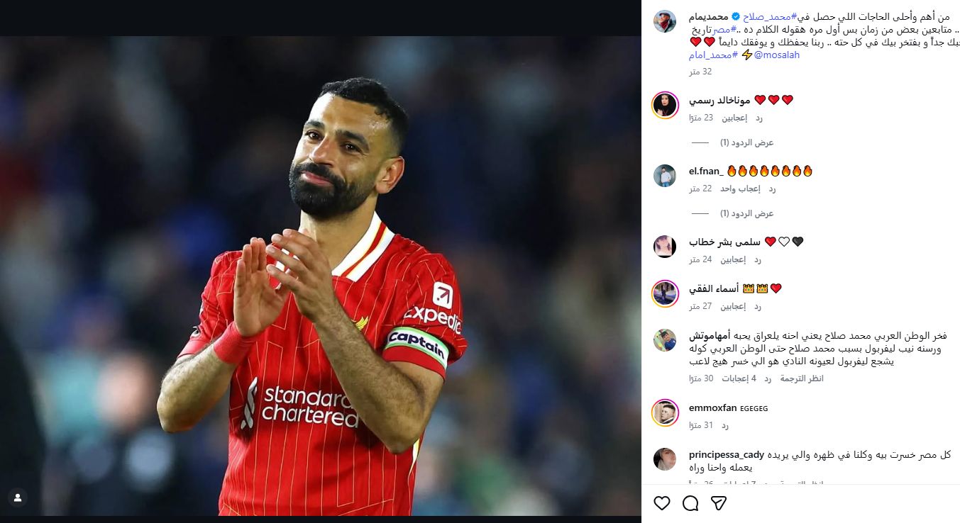 كتب الفنان محمد إمام عبر صفحته الشخصية على وسائل التواصل الاجتماعي: "محمد صلاح من أهم وأحلى الحاجات اللي حصلت في تاريخ مصر.. متابعين بعض من زمان بس أول مرة هقوله الكلام ده بحبك جدًا وبفتخر بيك في كل حته، ربنا يحفظك ويوفقك دايمًا"، وقد لاقت رسالة محمد إمام التي رصدها موقع تحيا مصر تفاعلًا واسعًا من الجمهور، حيث اعتبرها الكثيرون دعمًا مستحقًا لأيقونة مصرية استطاعت رفع اسم بلادها في أهم المحافل الرياضية، وأكدت الروابط القوية بين رموز الفن والرياضة في مصر.
