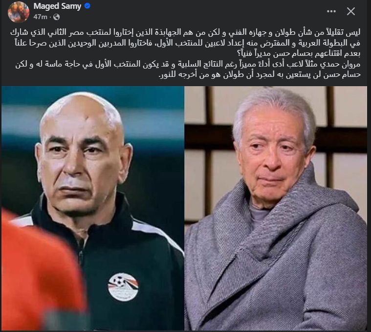 وكتب ماجد سامي عبر حسابه الرسمي"فيس بوك": ليس تقليلاً من شأن طولان و جهازه الفني، و لكن من هم الجهابذة الذين إختاروا لمنتخب مصر الثاني الذي شارك في البطولة العربية، والمفترض منه إعداد لاعبين للمنتخب الأول، فاختاروا المدربين الوحيدين الذين صرحا علناً بعدم اقتناعهم بحسام حسن مديراً فنياً؟".