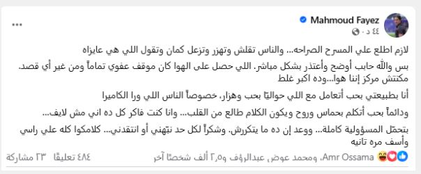 وفي منشور طويل عبر فيسبوك، قدّم فايز توضيحًا كاملًا للموقف، مؤكداً أن ما حدث كان عفوياً وغير مقصود، وأنه لم يكن يدرك في اللحظة ذاتها أن البث ما زال مستمرًا، موضحًا أنه بطبيعته يميل للهزار والتعامل بروح طيبة مع فريق العمل خلف الكاميرا، وأنه كان يعتقد أن الفقرة خارج الهواء، وهو ما جعله يتصرف تلقائيًا دون انتباه إلى أن الجمهور يشاهد المشهد.