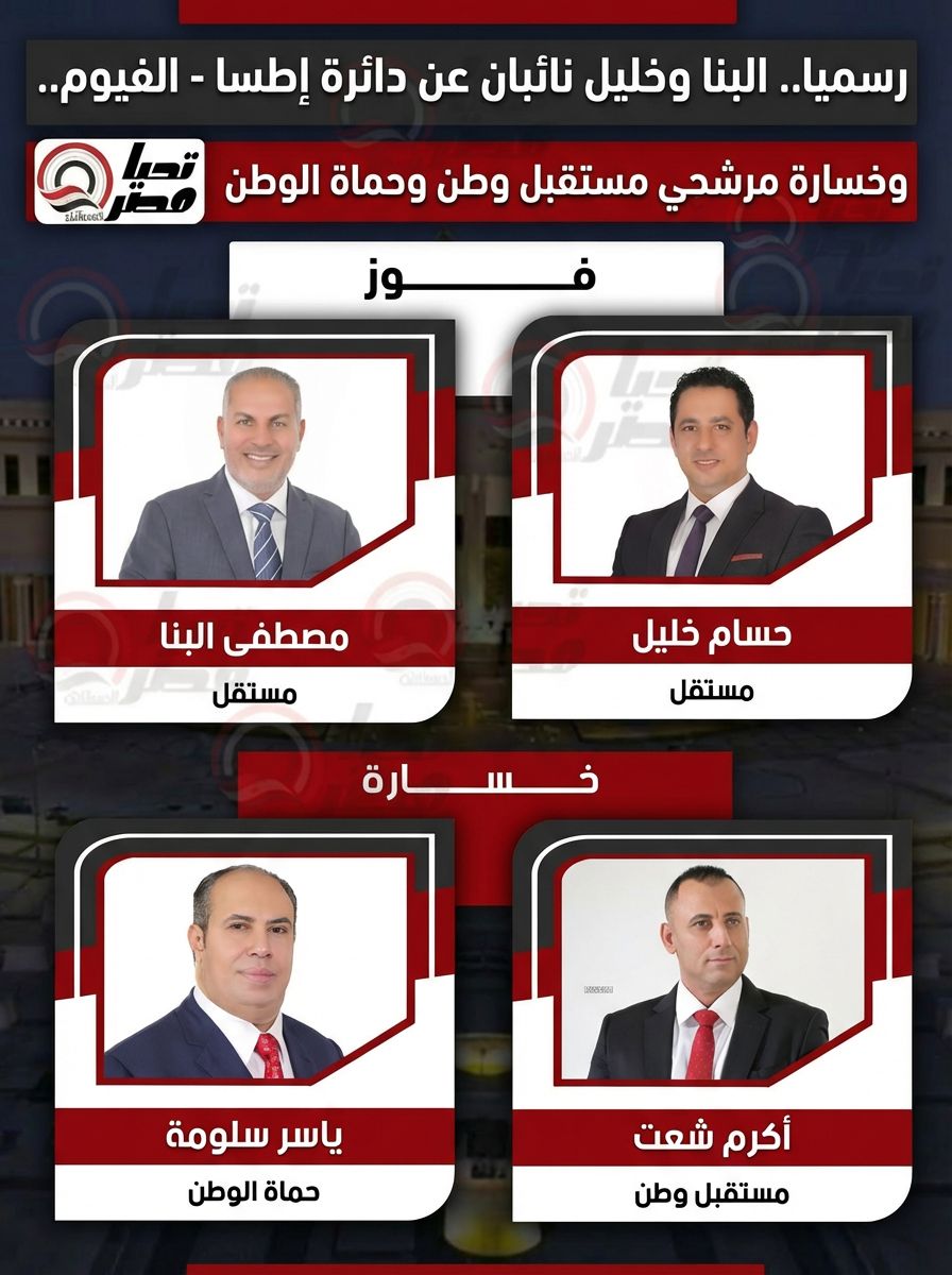 البنا وخليل نائبان عن دائرة إطسا - الفيوم.. وخسارة مرشحي مستقبل وطن وحماة الوطن