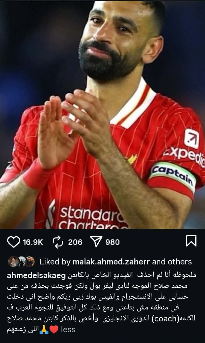 ونشر أحمد السقا صورة لـ محمد صلاح على حسابه الرسمي بموقع تبادل الصور والفيديوهات انستجرام، وعلق عليها في منشور رصده موقع تحيا مصر: "ملحوظه أنا لم احذف الفيديو الخاص بالكابتن محمد صلاح الموجه لنادى ليفر بول ولكن فوجئت بحذفه من على حسابي على الانستجرام والفيس بوك زيى زيكم واضح اني دخلت في منطقه مش بتاعتى ومع ذلك كل التوفيق للنجوم العرب في الكلمه (coach) الدورى الانجليزي وأخص بالذكر كابتن محمد صلاح اللي زعلتهم".