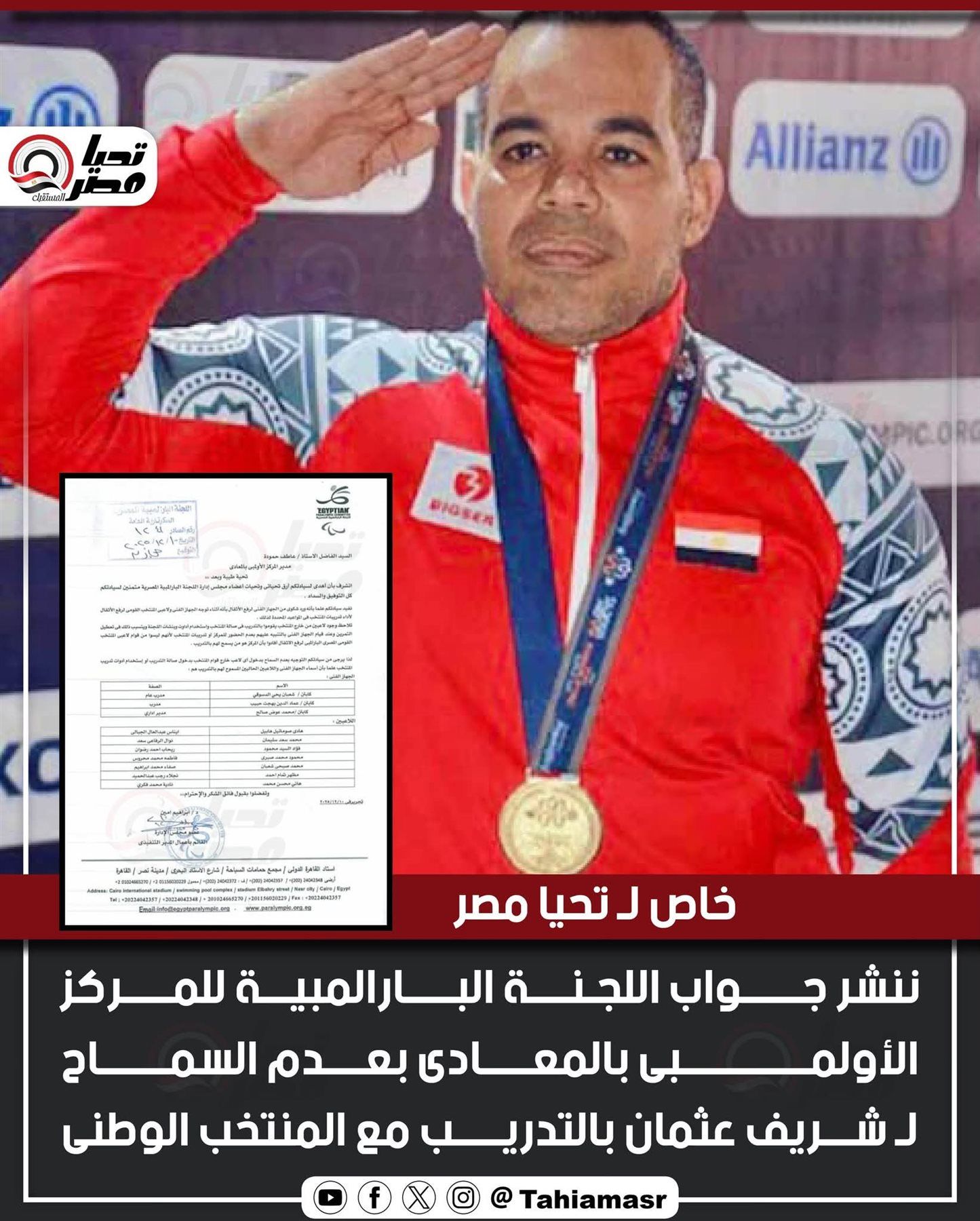 ينفرد موقع «تحيا مصر » بنشر تفاصيل الخطاب الرسمي الصادر عن اللجنة البارالمبية المصرية، برئاسة المستشار حسام الدين مصطفى، والموجه إلى إدارة المركز الأولمبي بالمعادي، والذي تضمن توجيها صريحا بعدم السماح للبطل البارالمبي شريف عثمان بالتدريب داخل صالة المنتخب القومي لرفع الأثقال البارالمبي، ويستعرض تحيا مصر التفاصيل.