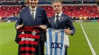 والتقى المهندس ممدوح عيد، بنائب رئيس نادي فلامنجو ورئيس بعثة الفريق في الدوحة، وتبادل الثنائي الهدايا التذكارية وقميصي الفريقين قبل انطلاق المباراة الهامة.