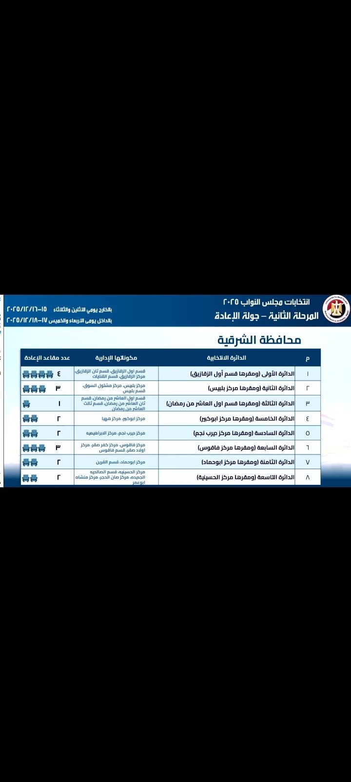 وتشهد محافظة الشرقية جولة إعادة ساخنة ضمن المرحلة الثانية، حيث تضم 8 دوائر انتخابية تتوزع على عدد من المراكز والأقسام الإدارية بالمحافظة.