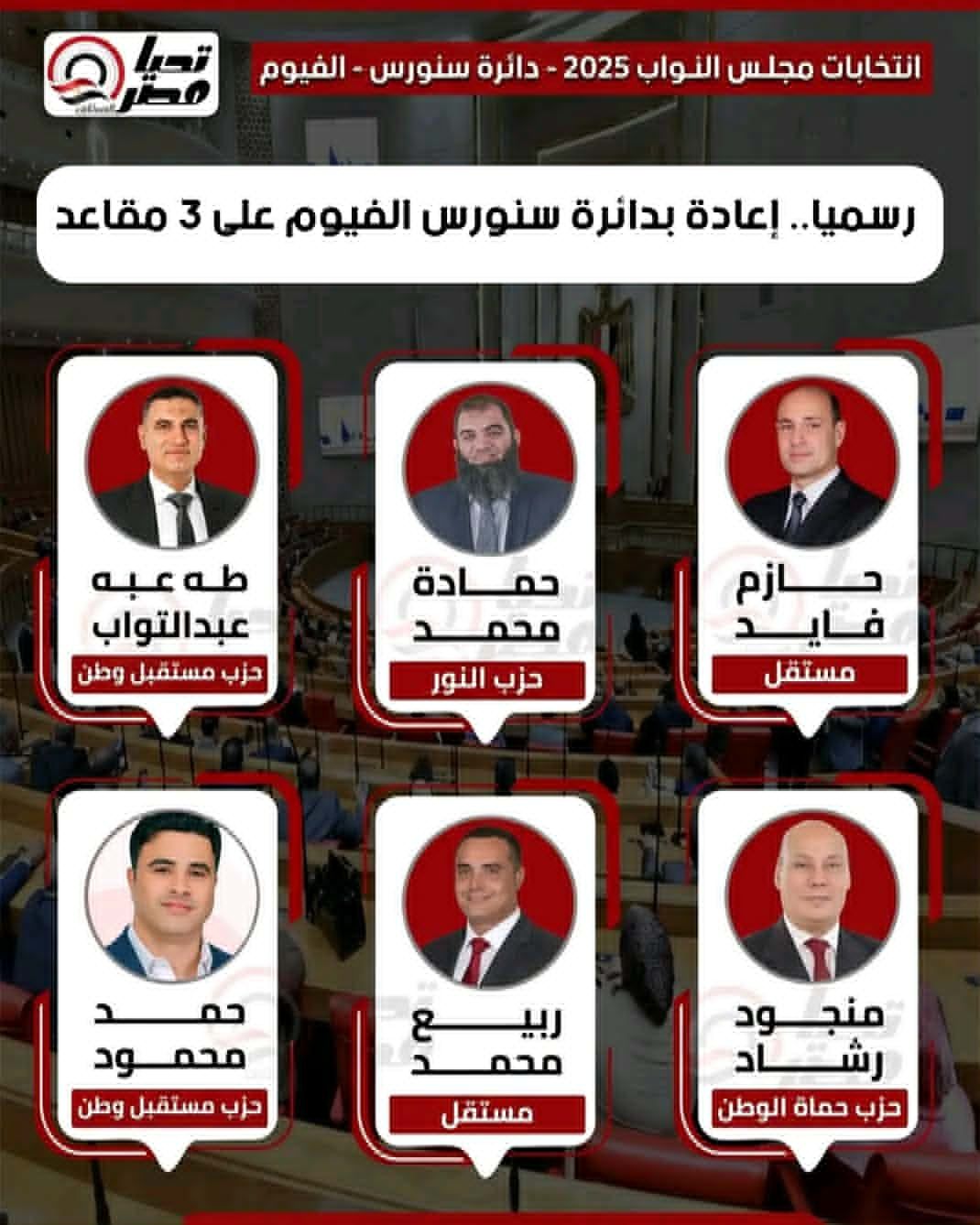 وأعلنت الهيئة الوطنية للانتخابات عن إجراء جولة الإعادة على دائرة سنورس وطامية – الفيوم، بين كلام من حازم فايد وحمادة محمد وطه عبد التواب ومنجود رشاد وربيع محمد وحمد محمود.