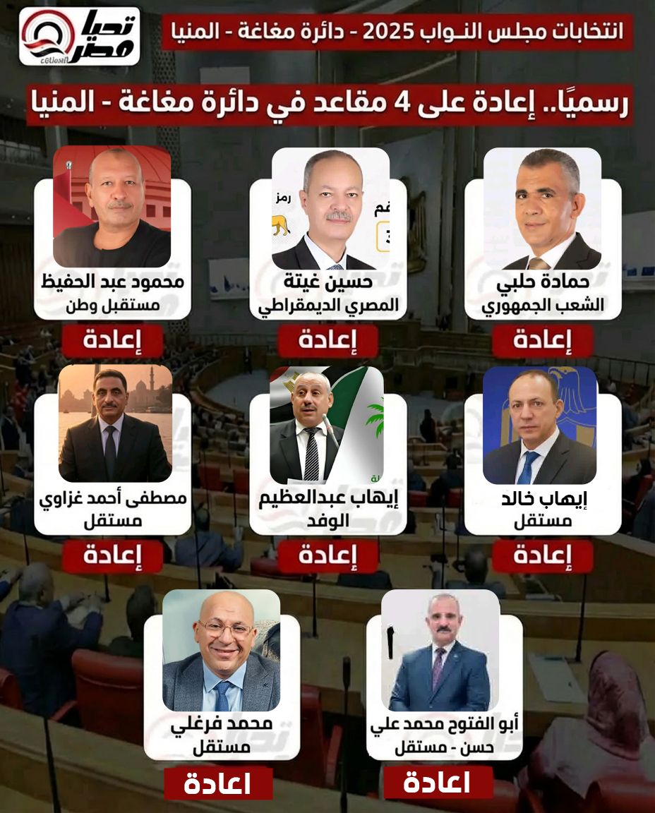 وأسفرت النتيجة عن خوض جولة إعادة مرتقبة في دائرة المغاغة بمحافظة المنيا، بين 8 مرشحين من بينهم 4 مستقلين و 4 مرشحين تابعين لأحزاب سياسية، وهما كل من: حمادة حلبي، (الشعب الجمهوري)، و حسين غيتة (المصري الديمقراطي الاجتماعي)، و محمود عبد الحفيظ (مستقبل وطن)، وإيهاب عبد العظيم (حزب الوفد)، وإيهاب خالد (مستقل)، و مصطفى أحمد غزاوي (مستقل)، وأبو الفتوح محمد علي (مستقل)، ومحمد فرغلي (مستقل).
