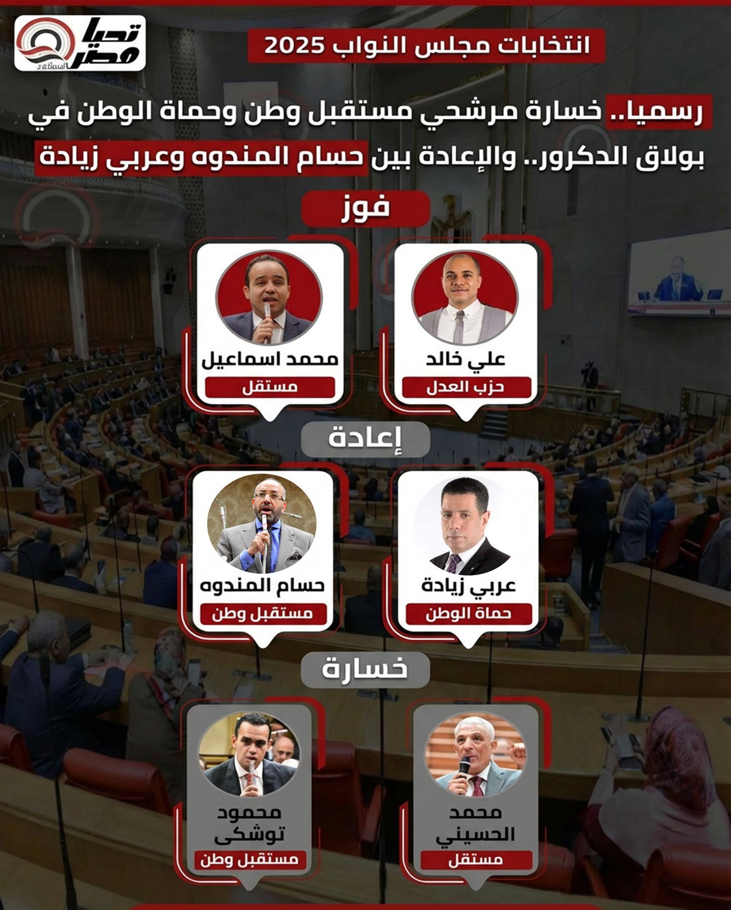 وأسفرت النتيجة عن حسم مقعدين من الثلاث مقاعد المخصصة لدائرة بولاق الدكرور، فيما يخوض مرشحين حزبيين جولة الإعادة على المقعد الثالث.