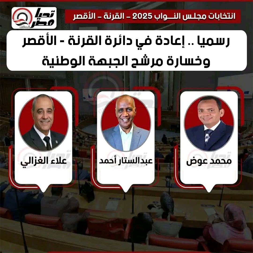 أعلنت الهيئة الوطنية للانتخابات، عن نتائج دائرة القرنة بمحافظة الأقصر، ضمن جولة الإعادة للمرحلة الثانية من انتخابات مجلس النواب 2025.
